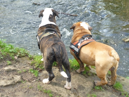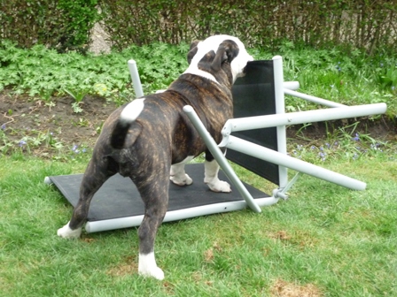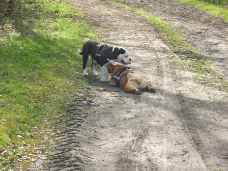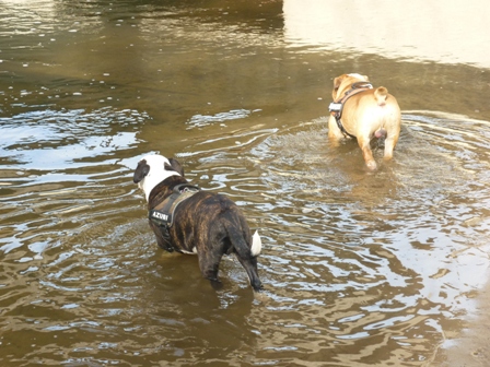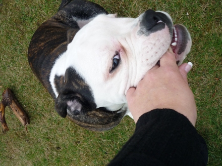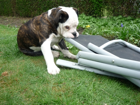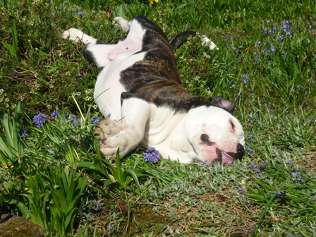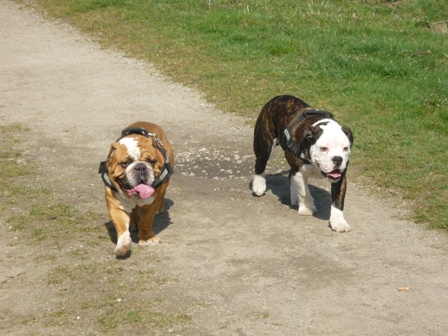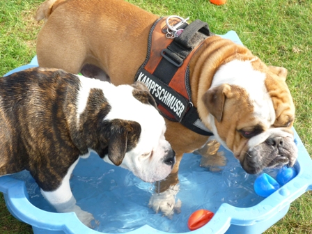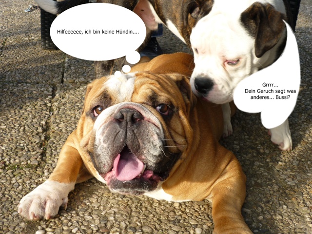 Was gibt es noch neues? Ach ja, wir sind jetzt im www.english-bulldogforum. Dort gibt es viele Hunde meiner Rasse, und eine Menge interessanter Themen, die man sich so durchlesen kann. Alle 2 Wochen sonntags treffen sich die Menschen mit ihren Bullys auf einer grossen Wiese. Wir Bullys können dort eine ganze Weile spielen und herumalbern. Wenn Mama mal Fragen hat, dann werden auch diese ganz schnell dort beantwortet. Die sind echt nett! Habe dort auch Paul kennengelernt. Paul ist ein EB, und Mama sagt, er sei ein Beispiel von einer Bulldogge. Er ist nämlich ganz schön geduldig beim Spielen, und total lieb. Ich bin ja noch etwas jünger, und manchmal ein kleiner Rabauke. Paul macht alles mit, ohne mich auch nur einmal zu beissen. Ich finde ihn klasse! Wir waren schon zusammen Gassi, schwimmen und bei mir im Garten toben. Er ist ein wahrer Kumpel! Öhm zum letzten Bild möchte ich gerne noch was sagen. An alle Hundedamen: Ich stehe auf Hündinnen, nicht auf Rüden..Aber manchmal riecht Paul eben so gut ...*rotwerd*
