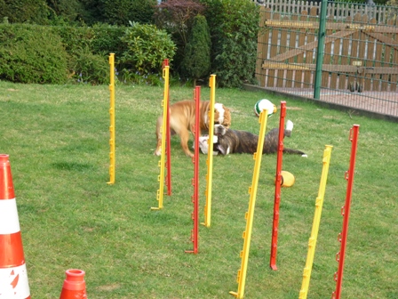 Leute ich habe ganz viele Bälle bekommen, und meinen eigenen Pool. Ausserdem hat Mama so Trainingsstangen geholt. Da laufe ich im Slalom durch biiiiiis mir schwindelig wird. Dann lass ich mich einfach fallen und dreh mich auf den Rücken. Dann kommt sie an und killert mir den Bauch. Ab und an bekomme ich auch ein Leckerchen, wenn ich was besonders gut gemacht habe. Mensch, was die sich immer darüber freut. Papa spielt ab und an Fußball mit mir im Garten. Ich muss euch jetzt nicht erklären wer schneller ist, oder? Ich bin ein Adler-Puma *popowackel*. Ich visiere den Ball ganz genau an, schleich mich ran, und wenn Papa dann eine Sekunde lang nicht hinsieht....Zack! Hab ihn.... Manchmal gebe ich ihn Papa zurück, aber viel lustiger ist es, wenn er mir hinterher läuft und ihn unbedingt haben will.
