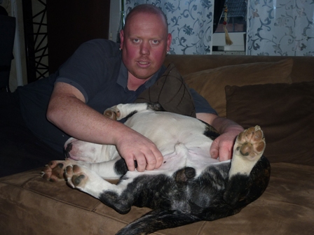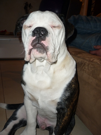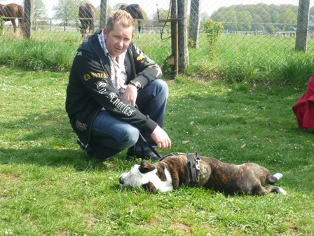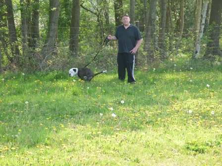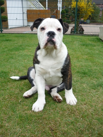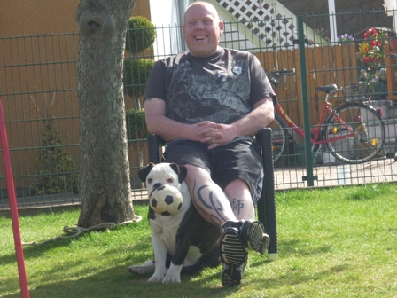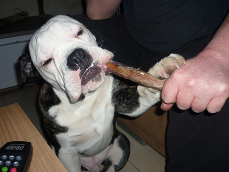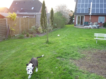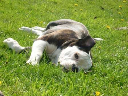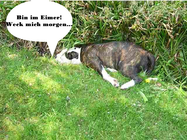 Zu meinem neuen Hobby gehört das Bienenzusabbern. Wie, kennste nicht? Echt easy! Also die fliegen ja immer die Blümchen an um was auch immer da zu machen. Ich schnapp mir eine, sabber sie komplett ein, naja und lass sie fallen. Dann können sie nicht mehr fliegen und müssen genauso laufen wie ich auch:-P Gibt Mecker von Mama, aber oft bekommt sie das gar nicht mit. Mama und Papa haben schon 2 Filme von mir gedreht, die man bei einem Ort namens Youtube sehen kann. Diesen Monat bin ich 6 Monate alt geworden. *juhuuuuu* War natürlich ein absoluter Grund für mich und meine Familie zu feiern. Die haben ihr Fleisch auf den heissen Stein geworfen (nennen die Grill), und ich bekam frische Hühnerherzen zur Feier des Tages. Abends sind dann noch einige Freunde von denen, und ein Kumpel von mir gekommen. Lennox! Lennox ist eine Mischung zwischen Deutscher Dogge und Labrador. Pahh is der schnell! Und gemein ist der auch. Der klaut mir mein Spielzeug, wartet bis ich es zurück haben will, und rennt dann damit einfach weg. Gemeinheit! Aber naja, soll er mal. Ich renn dem doch nicht den ganzen Tag hinterher... tztztztztz Bullys haben das nicht nötig :-P