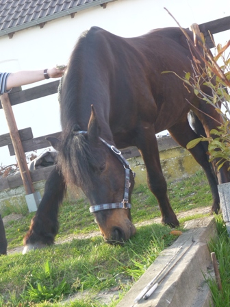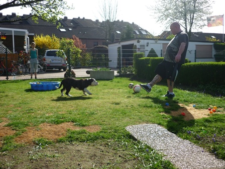 Papa und Patenonkel Muckel spielen jetzt ganz oft Fußball mit mir. Nach 10 Minuten haben wir folgendes Ergebnis: Onkel Muckel schreit nach einem Sauerstoffzelt, einem Liter Wasser und Pause. Papa fängt dann schon an zu schwitzen, und ich hab den Ball *hihi* Naja und Mama macht Bilder. Sie kann ja nicht rennen. Hat sich Anfang 2010 ihren Oberschenkel zertrümmert, als sie von Goliaths Rücken gefallen ist. Sie läuft immer fleissig mit ihrem roten Stock mit. Ist praktisch, denn so höre ich wann sie kommt *grins* Mamas Freundin Petra war auch hier. Wuuuahh sie ist eine echte Profikraulmaschine! Patenonkel Muckel ist eher für die Knochenhalte -und Massagetechnik zuständig. Der kann massieren, da denkt man jeder Muskel sei danach aus Butter. Knochenhalten kann der besonders gut. Wenn er uns besuchen kommt, renne ich gleich mit einem zu ihm hin. Beim Goliath waren wir auch. Mama hat ihn mir vorgestellt. Also der sieht ja schon wie ein mächtig grosser Hund aus, aber irgendwie verstehe ich nicht was er sagt. Entweder kommt er aus dem Ausland, oder ist wirklich ein "Pferd", so wie Mama es sagte.