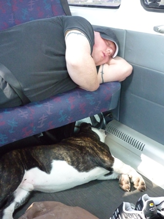 Nachdem sie alles erledigt hatte, ging die Fahrt los! Juhuuu! Ab in den Urlaub! Als erstes fuhr Papa! War gar nicht lange, als auf einmal mein Darm "Hallo" sagte. Uiuiuiui, war das knapp! Papa hielt sofort an, und Onkel Muckel ging schnell mit mir Gassi. Papa sah echt müde aus, also fuhr Mama weiter. Ich wurde auf einmal sooo müde... Papa und Onkel Muckel auch. Wir ratzten und schnarchten gemütich, bis Mama sagte:"Aufwachen, wir sind gleich da!" Was?? So schnell? Nee nix schnell, wir haben echt verpennt!