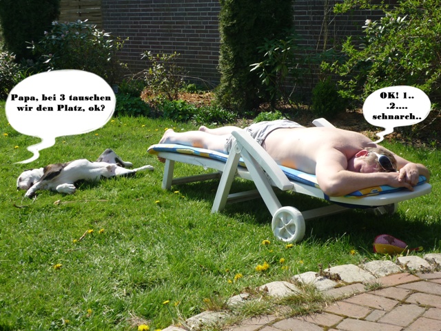 Haben wir nicht schon tolles Wetter da draussen? Mittlerweile bin ich fast den ganzen Tag im Garten. Schnüff schnüff hier, schnüff schnüff da. Es gibt ja so viele Dinge, die man draussen machen kann! Chillen, Fußball, Vögel jagen und und und. Durfte diesen Monat sogar mit Genehmigung eine Zewarolle zerpflücken. Wahnsinn! Aber das Spiel: Wenn ich dich nicht sehe, siehst du mich auch nicht, klappt nicht.. menno...