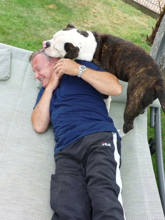 Oma und Opa waren auch oft da... Da musste ich dem Opa doch glatt mal zeigen, was ich mit Menschen mache, die sich einfach auf meine Sonneninsel legen. Anbellen, und wenn das alles nichts bringt, dann schlabber ich denen eben das Gesicht ab. Kenne da ja nichts! Meistens schreien die dann IHHHH und stehen freiwillig auf! Chacka, mein Garten, meine Liege!!!