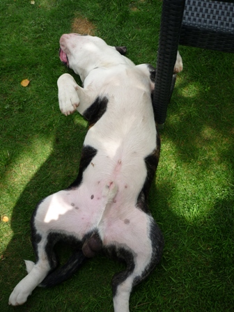 Ihr wollt wissen was mit der Begleithundeprüfung geworden ist?? Na was glaubt ihr denn?? Hey, ich bin zwar faul und hab nen Bullykopf, aber ich bin doch nicht blöd! Klar habe ich bestanden, sogar sehr gut! Den ganzen Tag gabs darauf richtig leckere Schmakofatz Sachen. Bor die waren ja soooo stolz auf mich! Und ich muss sagen, ich war ja selbst von mir überrascht. Hab nichts vergessen... Bin nur einmal zu früh aufgestanden, ok. Aber mein Gott, was soll ich da auch so lange rumliegen, wenn ich weiss was als nächstes kommt? Dafür ist mir meine Zeit echt zu schade!!!