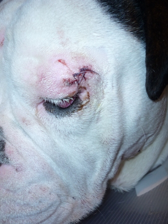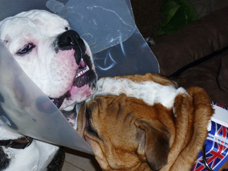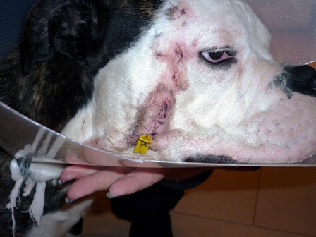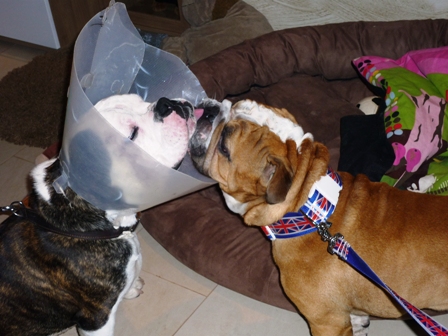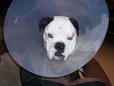 Ja und dann ist da noch was ganz blödes passiert. Ich wurde gebissen... Das tat ja echt weh! Also so ein Bullterrier hat echt nen starken Kiefer. Mama und Papa sind schnell mit mir in die Tierklinik gefahren. Und dann haben die mich da alleine gelassen. Die durften nicht bei mir sein. Mama musste weinen, als sie der Ärztin meine Leine in die Hand gab. Wusste erst gar nicht was los war und hatte Angst, aber die war echt nett. Dann hat es einmal gepiekst, und ich hab geschlummert. Als ich wach wurde hatte ich Kirmes im Kopf, und dann kamen auch schon Mama und Papa. Man hab ich mich gefreut die zu sehen..... Und die sich erst mal... Sind dann ins Auto, und ich hab sofort wieder geschlafen. Irgendwann waren wir dann Zuhause und ich wurde geweckt. War ich vielleicht platt... Und dann hatte ich auch noch dieses blöde Ding um den Kopf. Konnte mich kaum damit bewegen. Papa hat es dann gekürzt, und dann ging es schon viel besser. Freund Paul hat mir auch einen Krankenbesuch abgestattet. Fand ich echt cool! Mein ganz privater Krankenpfleger:-) Danke Paul, bist ein echter Kumpel!